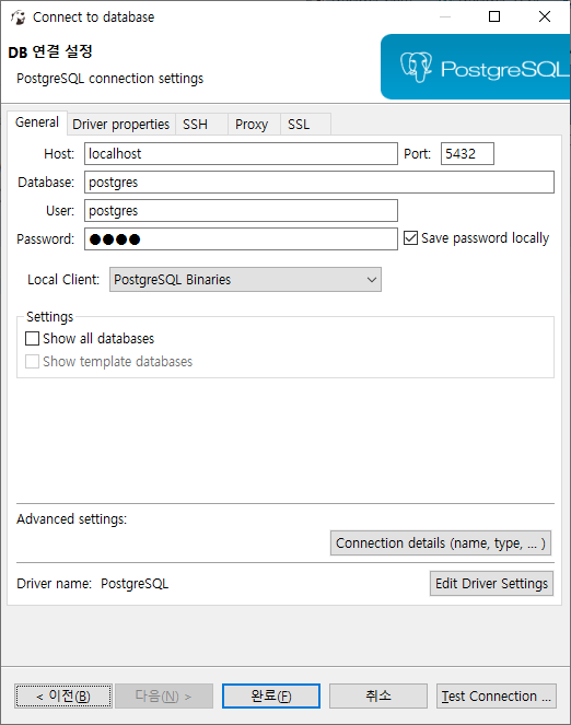 PostgreSQL을 선택하고 서버 접속정보를 입력한다.